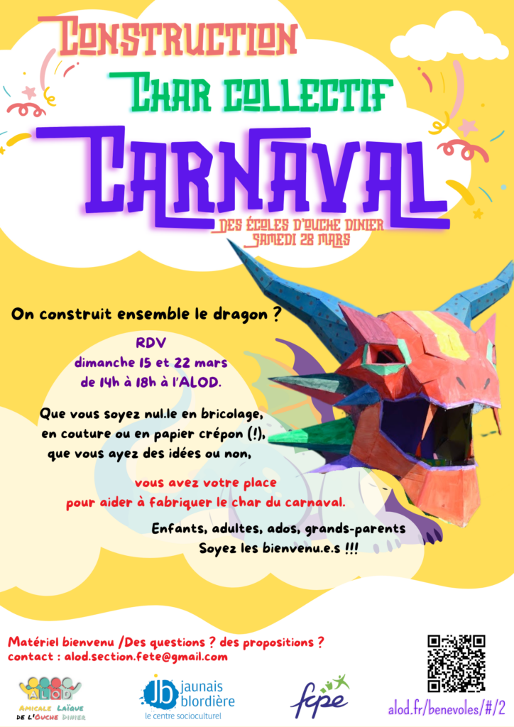 Le Carnaval de l’OucheDinier arrive à grands pas ! Samedi 29 Mars, c’est le Carnaval, tant attendu par vos enfants (et par vous aussi sûrement !). L’occasion de se faire pleins de joyeux souvenirs !!